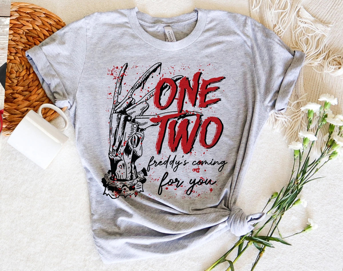 One Two Freddy's Coming For You - Halloween Horror T-Shirt Unisex Crew Neck. Printed on high-quality, super soft t-shirts. You won't experience fading or cracking. We print with water-based inks that are also non-harmful to the environment :)