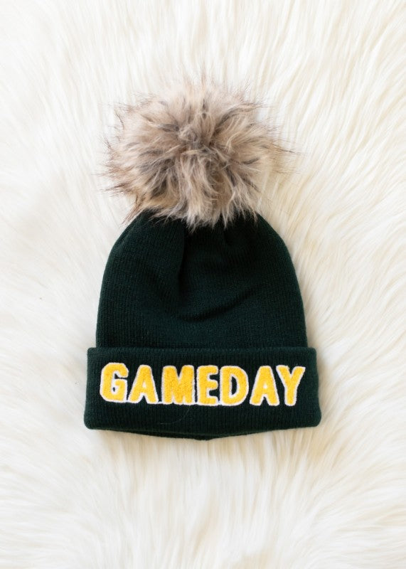 Green knit pom hat Gold textured "GAMEDAY" text on cuff Natural faux fur pom accent Fleece lined 100% Acrylic