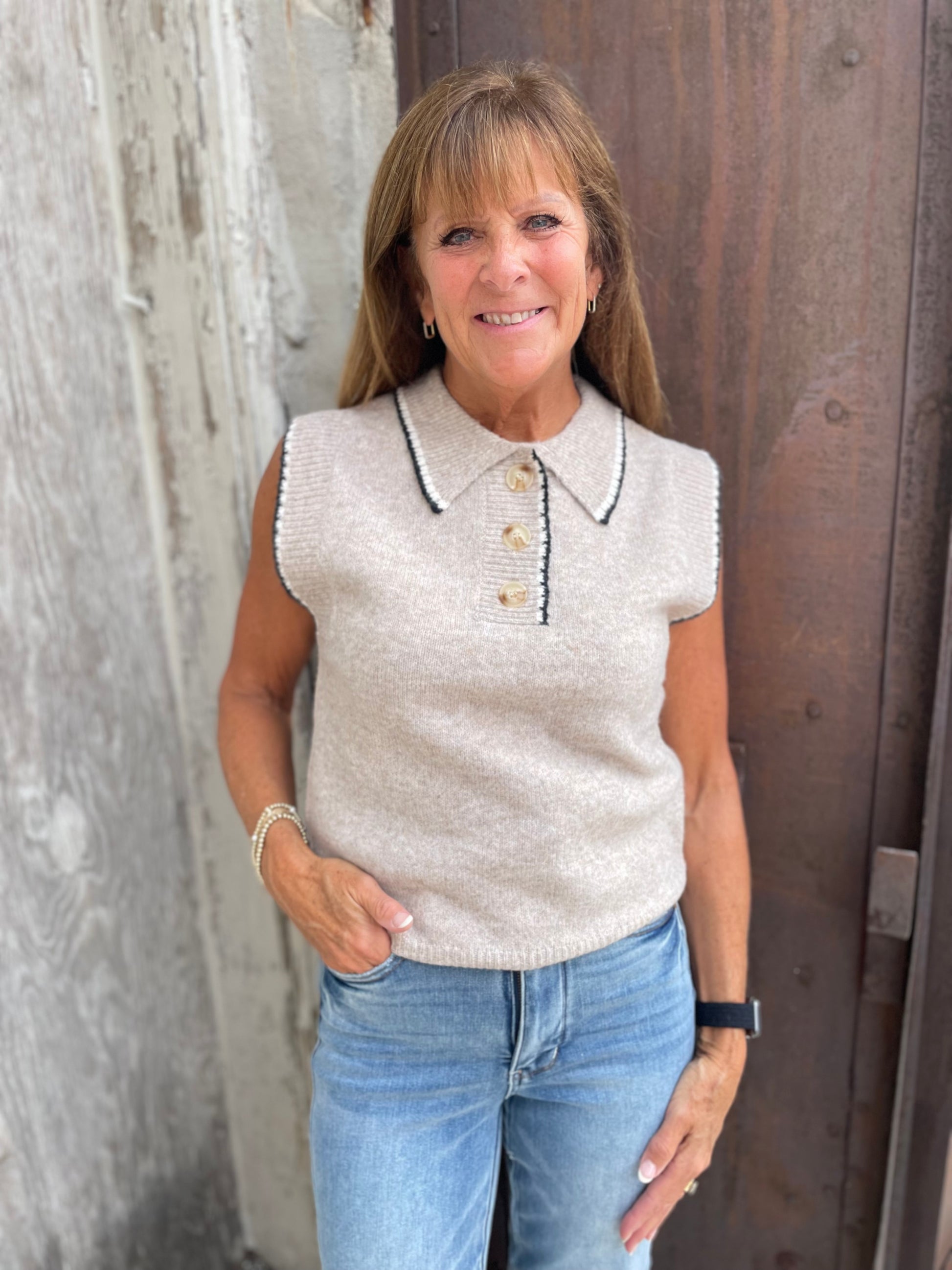 This sleeveless sweater top. Crafted in a soft sweater knit, it features a classic collar with button front detailing. The black and ivory color stitch detailing on the collar and armholes. Perfect for pairing with denim shorts for a relaxed yet put-together look. *detail* -Relaxed fit -Placket with button front -Sleeveless -Collar -Made with soft sweater knit