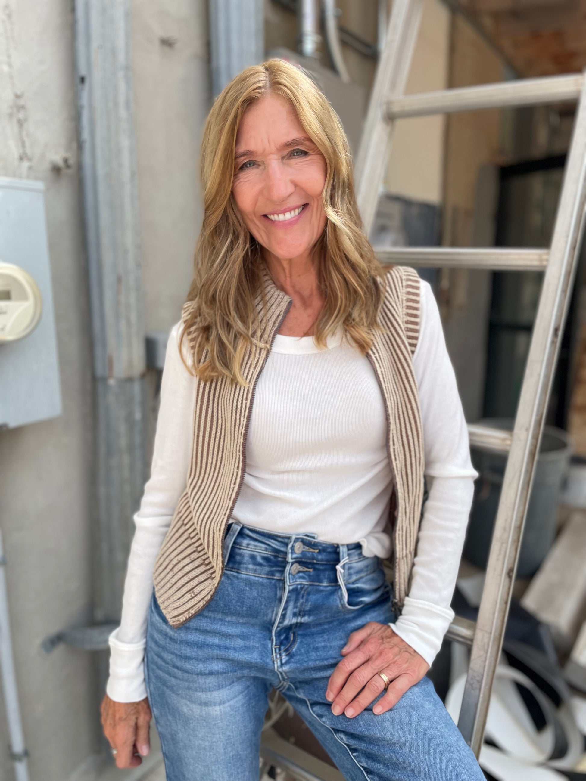 This sleeveless zip up jacket showcases a two tone vertical ribbed knit,