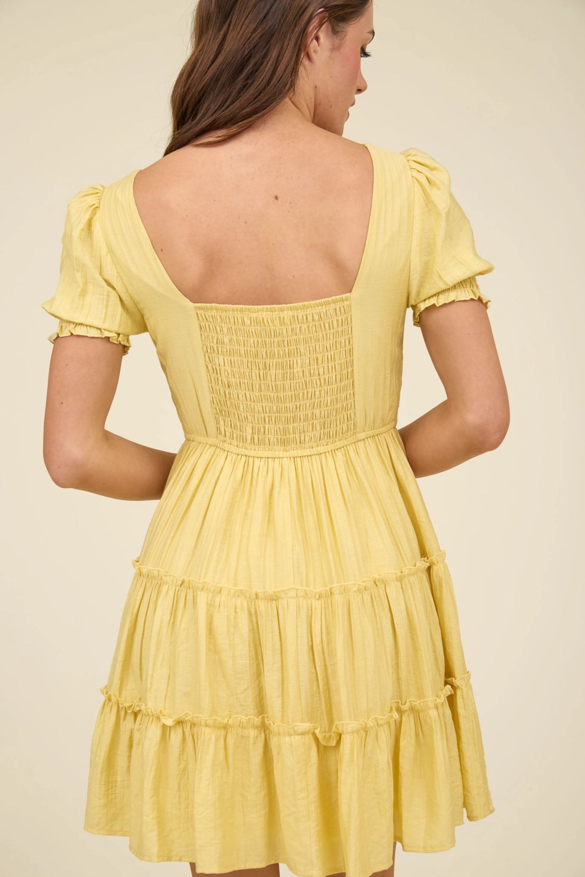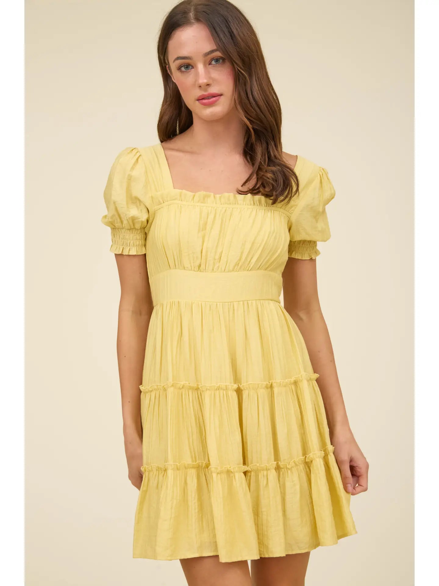 Square neckline Short puff sleeves Smocked sleeve and waist detail Back smocking Ruffle detail Tiered Solid Lined Midi dress Shell: 70% rayon, 30% nylon Lining: 100% polyester