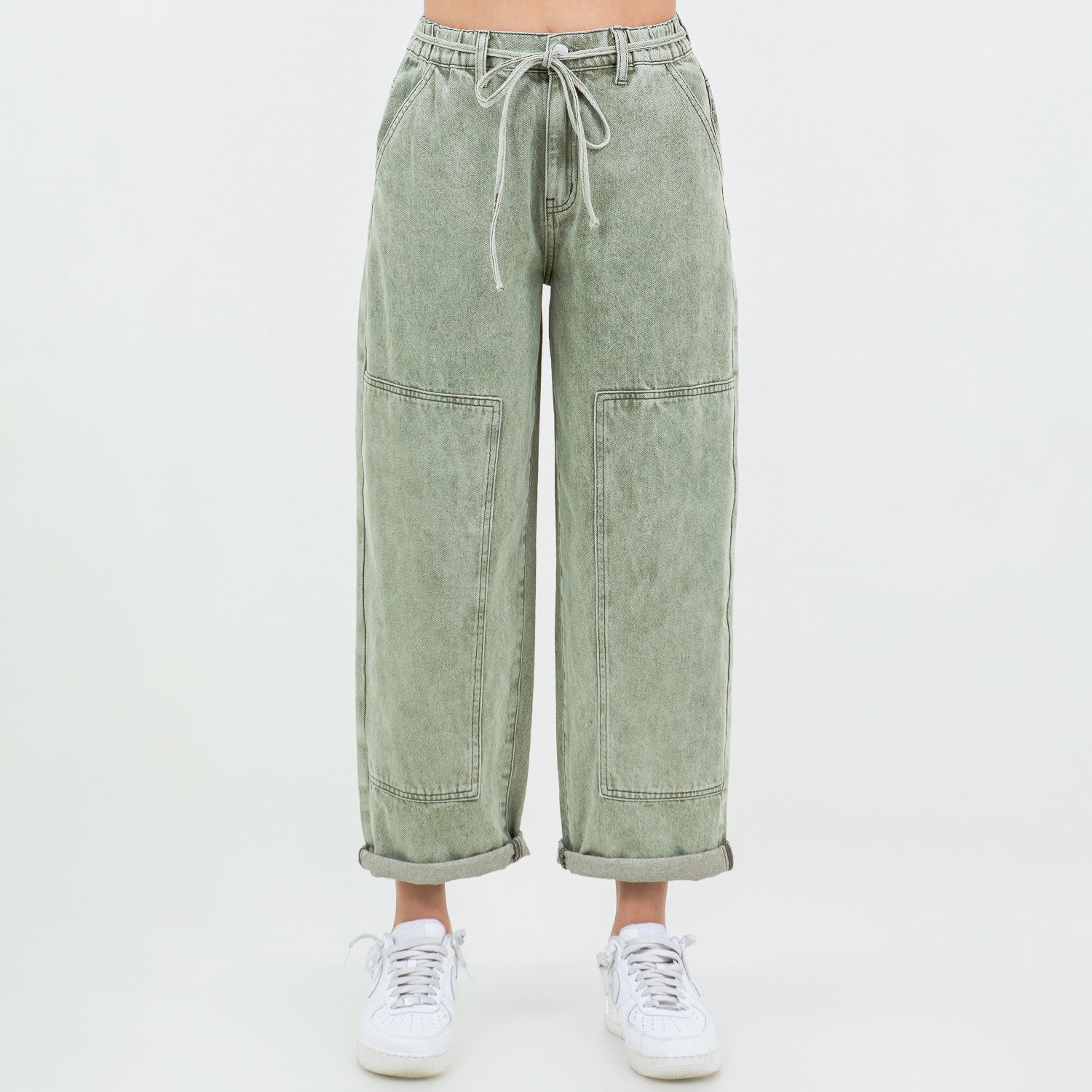 Color washed barrel fit pants - Button waist closure - Waist string - Barrel fit, folding hem Size s : waist - 27 inch, inseam - 28.5 inch