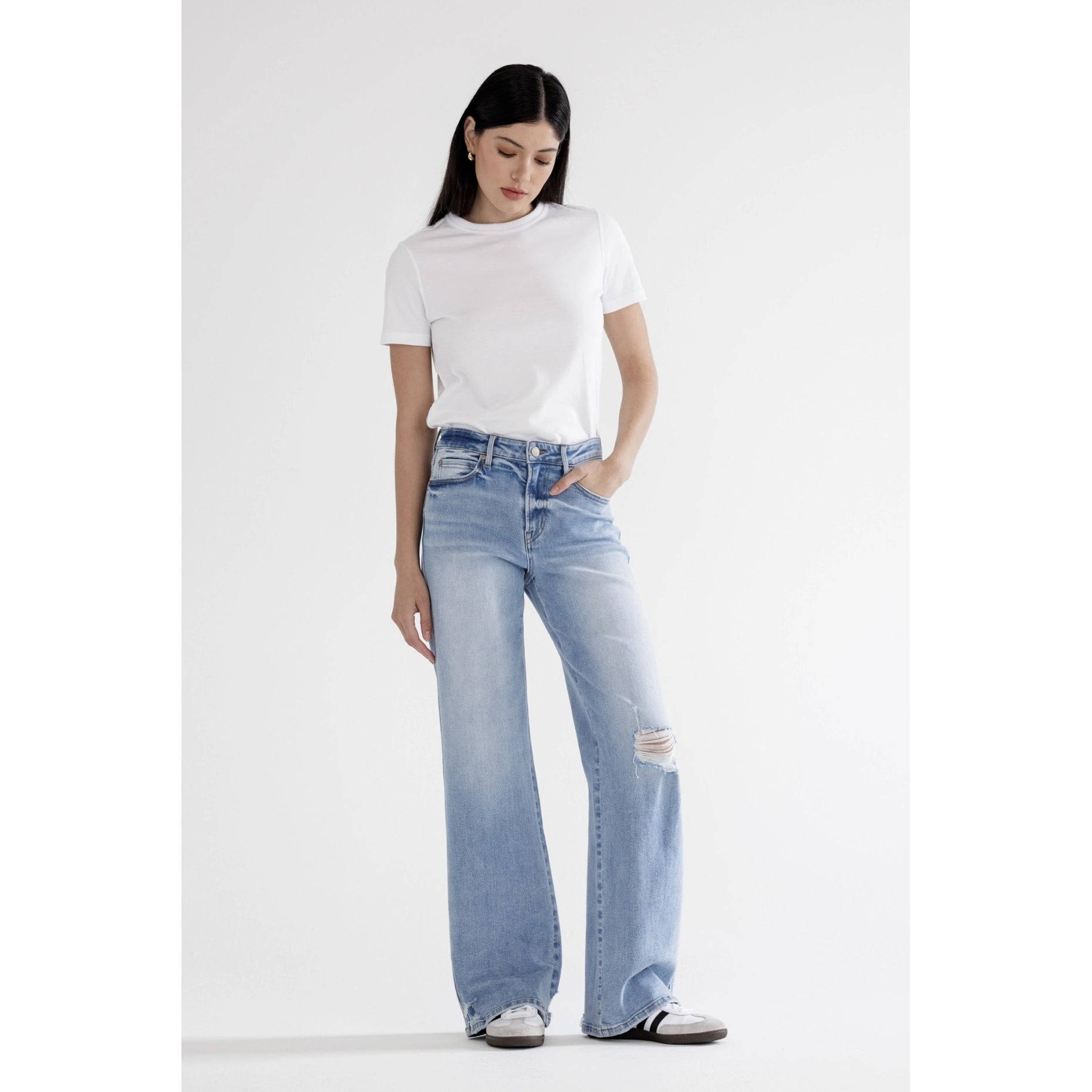 High rise wide w/ knee distressed 93% cotton, 5% poly, 2% span Front rise : 10 11/2" Inseam : 33" Leg opening : 20 1/2"