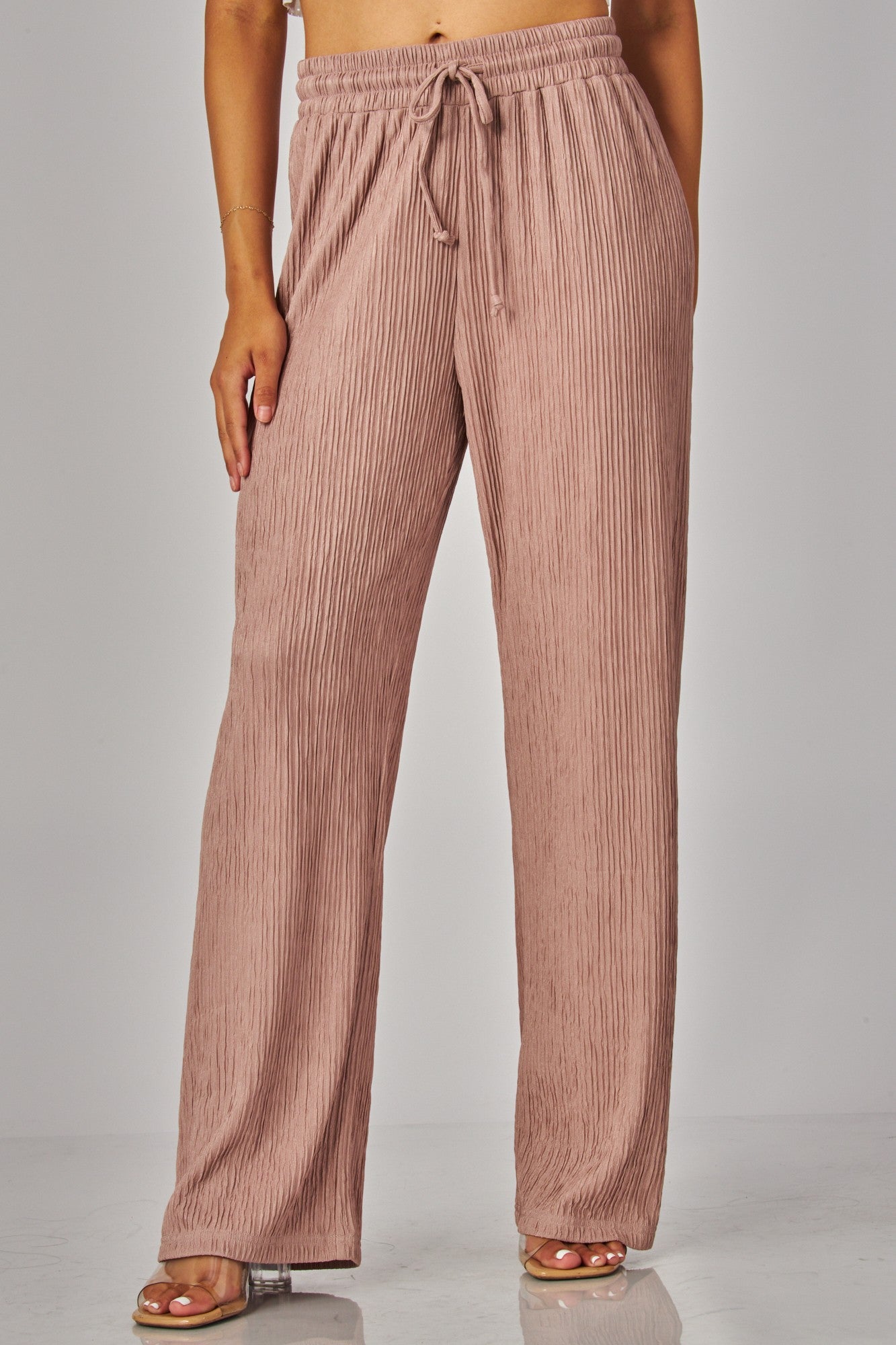 This ensemble invites you to indulge in the luxurious feel of finely pleated plisse fabric, designed to capture the essence of sophisticated leisure. The pant drapes beautifully over the wide-leg frame.