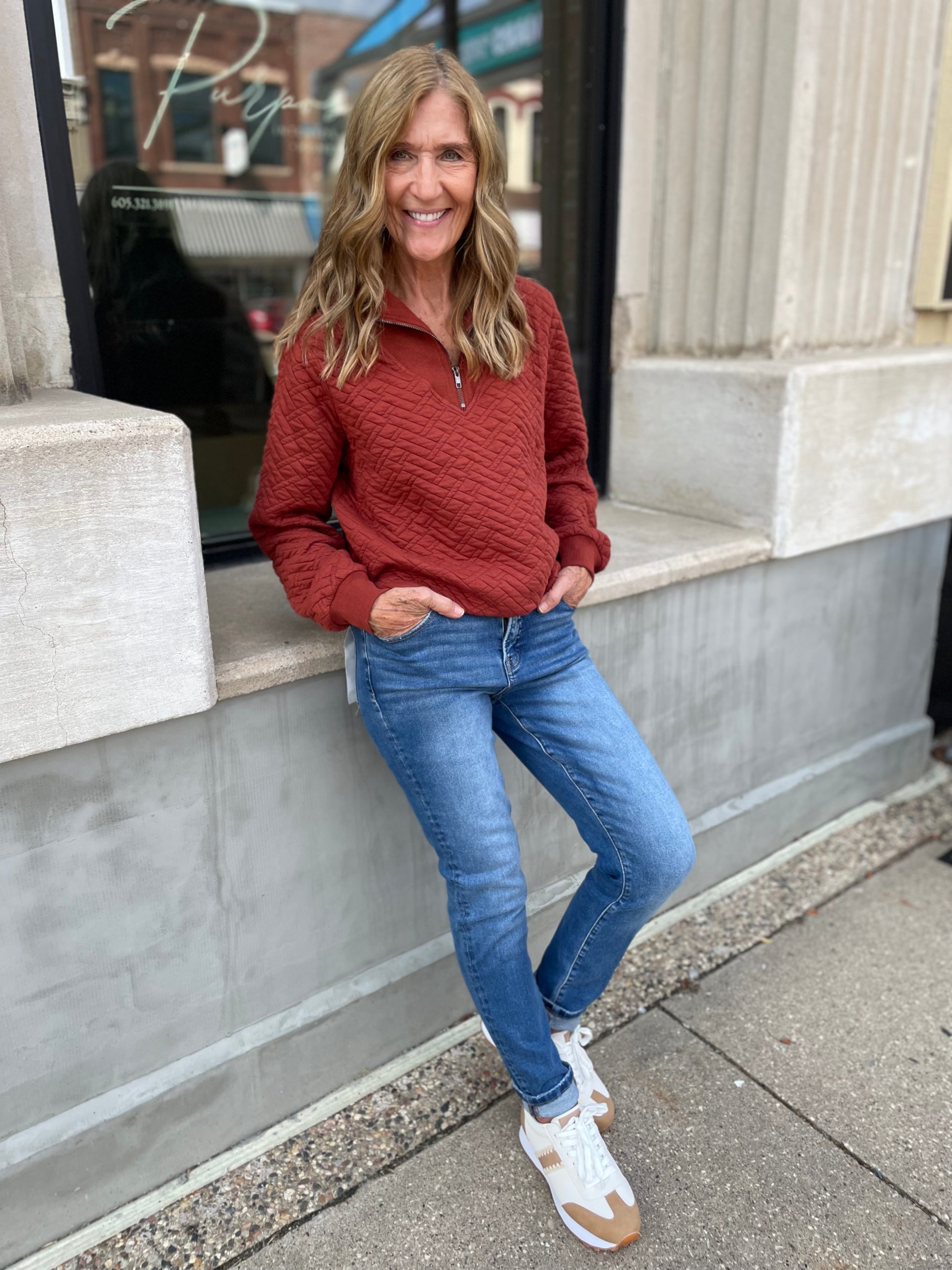 QUILTED TOP WITH FRONT HALF ZIP UP - Brick-red quilted pullover top - Stylish front half zip-up closure for adjustable neckline - Soft, textured geometric quilt pattern throughout - Ribbed collar, cuffs, and hem for a snug fit STYLE MEASUREMENTS (SIZE SMALL) -Total Length 25" -Shoulder 15 1/2" -Bust 21" -Sleeve Length 25" 52%POLYESTER 45%COTTON 3%SPANDEX | CONT:70%COTTON25%POLY5%SP