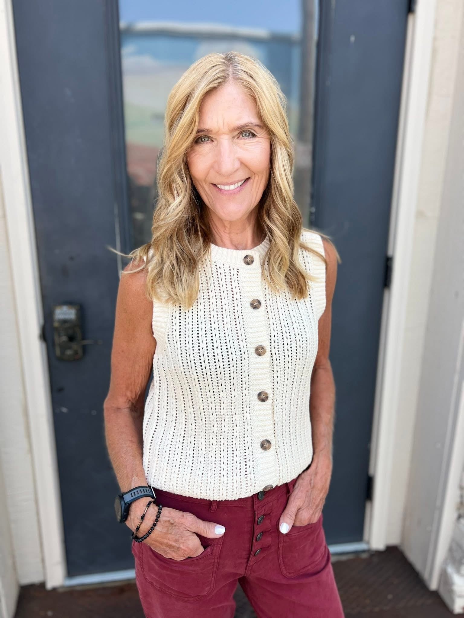 CREW NECKLINE SLEEVELESS BUTTON DOWN CROCHET SWEATER KNIT RIBBED TRIM SOLID NOT LINED CARDIGAN VEST 100% COTTON